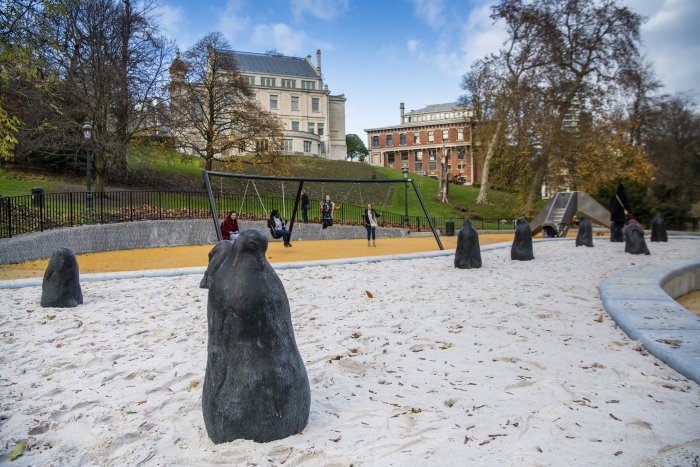La plaine de jeux nécessitait une rénovation et est maintenant équipée de quatre balançoires, d’un grand toboggan et d’un bac à sable. Les dalles colorées en caoutchouc apportent non seulement une touche de gaieté, mais permettent également d’amortir les chutes. Dans le bac à sable, les enfants jouent sur et autour de petites statues de pingouins, évoquant ainsi le passé du parc, qui était à l’origine un jardin zoologique.